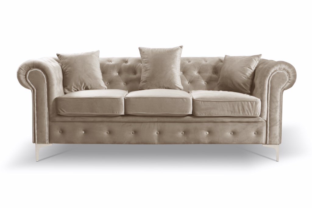 - Scrolled round arms with button detailing. Traditional Chesterfield Feature