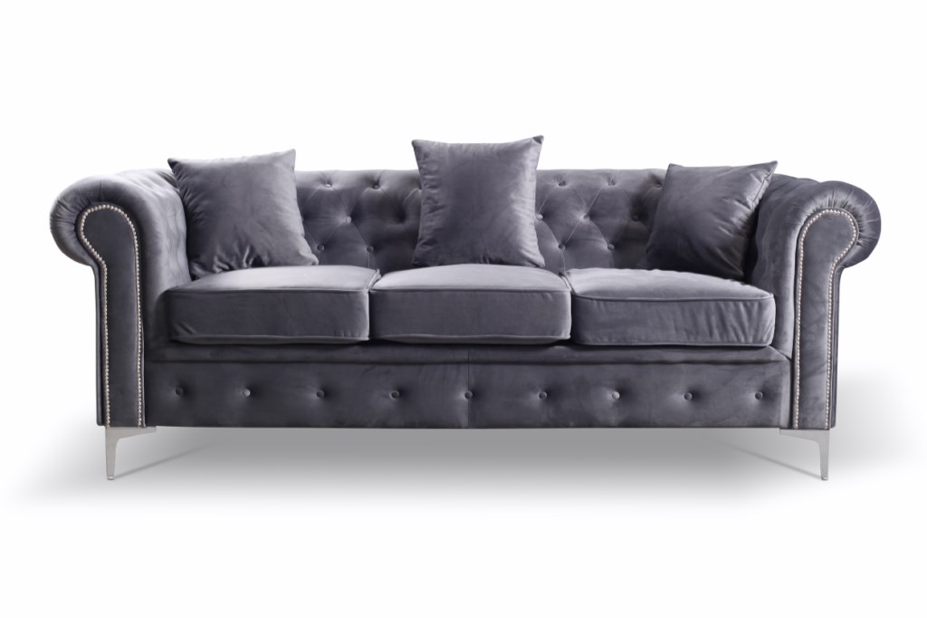 - Scrolled round arms with button detailing. Traditional Chesterfield Feature
