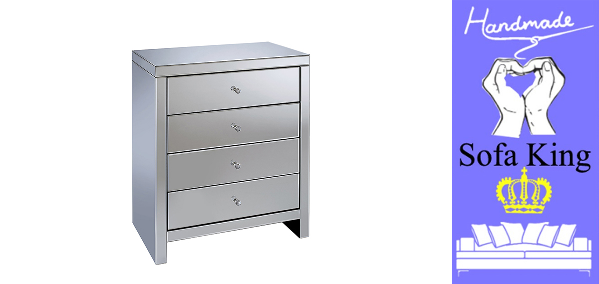 Constructed from a MDF frame this 4 drawer chest features beautiful bevelled edges along with mock crystal handles.