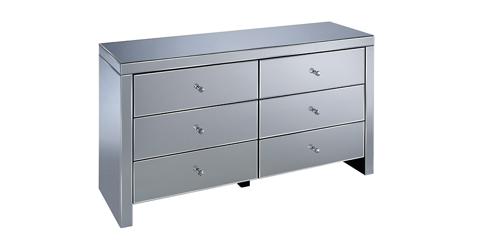 Constructed from a MDF frame this 6 drawer chest features beautiful bevelled edges along with mock crystal handles.